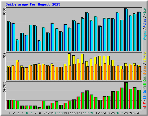 | Day | Hits | Files | Pages | Visits | Sites | kB F | kB In | kB Out | ||||||||
